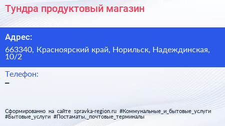 Тундра, продуктовый магазин по адресу 663340, Красноярский край, Норильск, Надеждинская, 10/2 в дальнейшем Организация, размещена в следующих категориях: