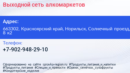 Выходной, сеть алкомаркетов по адресу 663302, Красноярский край, Норильск, Солнечный проезд, 8 к2 в дальнейшем Организация, размещена в следующих категориях: