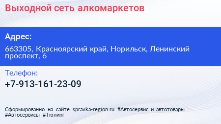 Выходной, сеть алкомаркетов по адресу 663305, Красноярский край, Норильск, Ленинский проспект, 6 в дальнейшем Организация, размещена в следующих категориях: