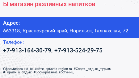 Ы, магазин разливных напитков по адресу 663318, Красноярский край, Норильск, Талнахская, 72 в дальнейшем Организация, размещена в следующих категориях: