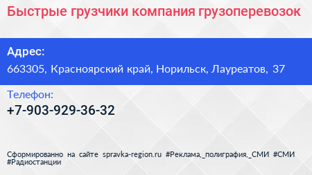 Быстрые грузчики, компания грузоперевозок по адресу 663305, Красноярский край, Норильск, Лауреатов, 37 в дальнейшем Организация, размещена в следующих категориях: