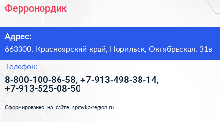 Ферронордик по адресу 663300, Красноярский край, Норильск, Октябрьская, 31в в дальнейшем Организация, размещена в следующих категориях: