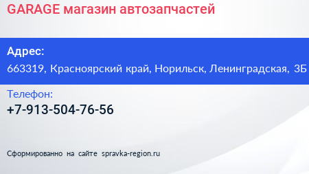 GARAGE, магазин автозапчастей по адресу 663319, Красноярский край, Норильск, Ленинградская, 3Б в дальнейшем Организация, размещена в следующих категориях:
