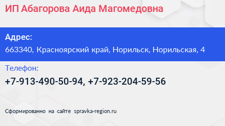 ИП Абагорова Аида Магомедовна по адресу 663340, Красноярский край, Норильск, Норильская, 4 в дальнейшем Организация, размещена в следующих категориях: