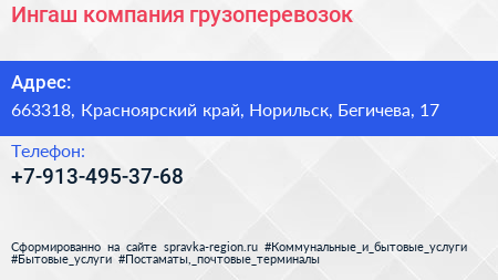 Ингаш, компания грузоперевозок по адресу 663318, Красноярский край, Норильск, Бегичева, 17 в дальнейшем Организация, размещена в следующих категориях: