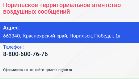 Норильское территориальное агентство воздушных сообщений по адресу 663340, Красноярский край, Норильск, Победы, 1а в дальнейшем Организация, размещена в следующих категориях: