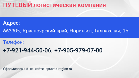 ПУТЕВЫЙ, логистическая компания по адресу 663305, Красноярский край, Норильск, Талнахская, 16 в дальнейшем Организация, размещена в следующих категориях: