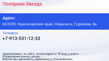 Полярная Звезда по адресу 663330, Красноярский край, Норильск, Горняков, 8а в дальнейшем Организация, размещена в следующих категориях: