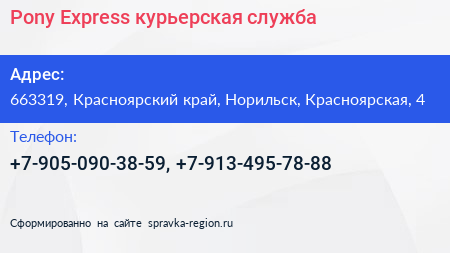 Pony Express, курьерская служба по адресу 663319, Красноярский край, Норильск, Красноярская, 4 в дальнейшем Организация, размещена в следующих категориях: