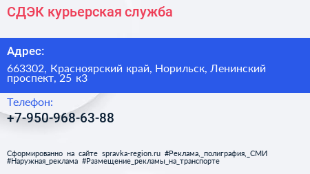 СДЭК, курьерская служба по адресу 663302, Красноярский край, Норильск, Ленинский проспект, 25 к3 в дальнейшем Организация, размещена в следующих категориях: