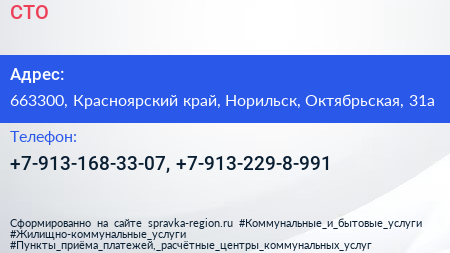 СТО по адресу 663300, Красноярский край, Норильск, Октябрьская, 31а в дальнейшем Организация, размещена в следующих категориях: