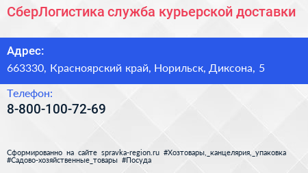 СберЛогистика, служба курьерской доставки по адресу 663330, Красноярский край, Норильск, Диксона, 5 в дальнейшем Организация, размещена в следующих категориях: