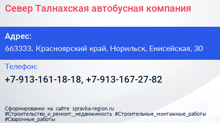Север, Талнахская автобусная компания по адресу 663333, Красноярский край, Норильск, Енисейская, 30 в дальнейшем Организация, размещена в следующих категориях: