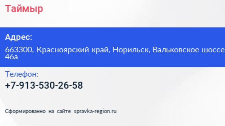 Таймыр по адресу 663300, Красноярский край, Норильск, Вальковское шоссе, 46а в дальнейшем Организация, размещена в следующих категориях: