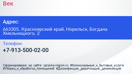 Век по адресу 663305, Красноярский край, Норильск, Богдана Хмельницкого, 2 в дальнейшем Организация, размещена в следующих категориях: