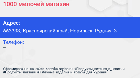 1000 мелочей, магазин по адресу 663333, Красноярский край, Норильск, Рудная, 3 в дальнейшем Организация, размещена в следующих категориях: