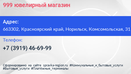 999, ювелирный магазин по адресу 663302, Красноярский край, Норильск, Комсомольская, 31 в дальнейшем Организация, размещена в следующих категориях: