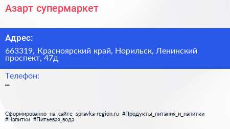 Азарт, супермаркет по адресу 663319, Красноярский край, Норильск, Ленинский проспект, 47д в дальнейшем Организация, размещена в следующих категориях: