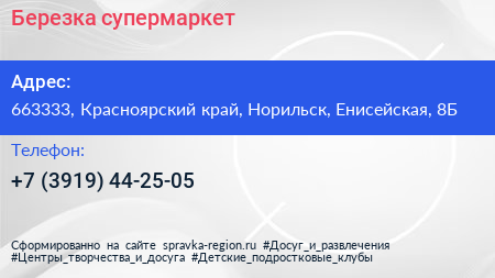 Березка, супермаркет по адресу 663333, Красноярский край, Норильск, Енисейская, 8Б в дальнейшем Организация, размещена в следующих категориях: