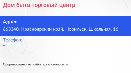 Дом быта, торговый центр по адресу 663340, Красноярский край, Норильск, Школьная, 16 в дальнейшем Организация, размещена в следующих категориях: