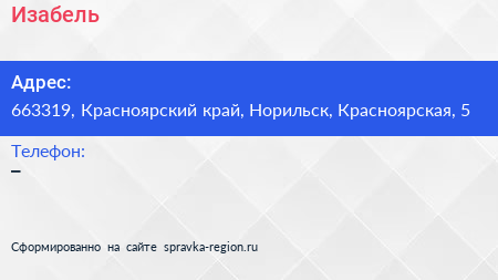 Изабель по адресу 663319, Красноярский край, Норильск, Красноярская, 5 в дальнейшем Организация, размещена в следующих категориях: