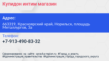Купидон, интим-магазин по адресу 663319, Красноярский край, Норильск, площадь Металлургов, 3а в дальнейшем Организация, размещена в следующих категориях: