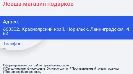 Левша, магазин подарков по адресу 663302, Красноярский край, Норильск, Ленинградская, 4 к2 в дальнейшем Организация, размещена в следующих категориях: