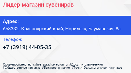 Лидер, магазин сувениров по адресу 663332, Красноярский край, Норильск, Бауманская, 8а в дальнейшем Организация, размещена в следующих категориях: