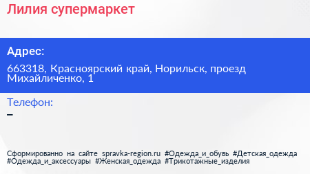 Лилия, супермаркет по адресу 663318, Красноярский край, Норильск, проезд Михайличенко, 1 в дальнейшем Организация, размещена в следующих категориях: