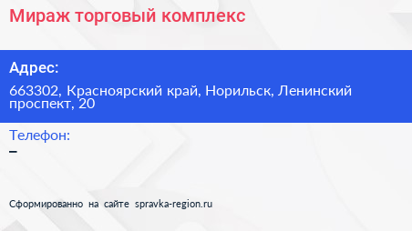 Мираж, торговый комплекс по адресу 663302, Красноярский край, Норильск, Ленинский проспект, 20 в дальнейшем Организация, размещена в следующих категориях: