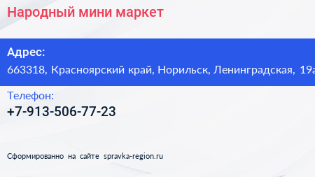 Народный, мини-маркет по адресу 663318, Красноярский край, Норильск, Ленинградская, 19а в дальнейшем Организация, размещена в следующих категориях: