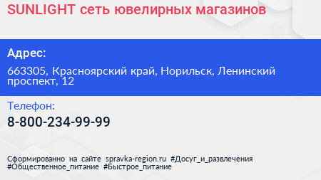 SUNLIGHT, сеть ювелирных магазинов по адресу 663305, Красноярский край, Норильск, Ленинский проспект, 12 в дальнейшем Организация, размещена в следующих категориях: