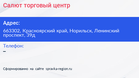 Салют, торговый центр по адресу 663302, Красноярский край, Норильск, Ленинский проспект, 39д в дальнейшем Организация, размещена в следующих категориях: