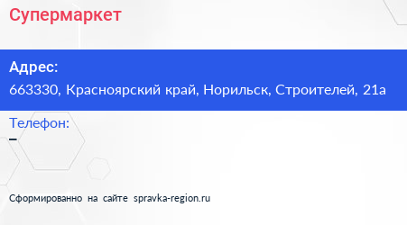 Супермаркет по адресу 663330, Красноярский край, Норильск, Строителей, 21а в дальнейшем Организация, размещена в следующих категориях: