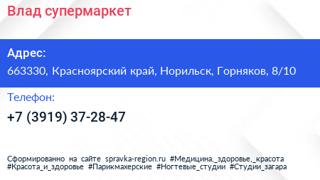 Влад, супермаркет по адресу 663330, Красноярский край, Норильск, Горняков, 8/10 в дальнейшем Организация, размещена в следующих категориях: