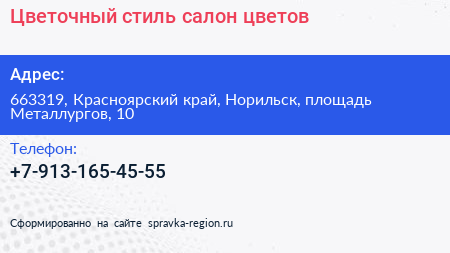 Цветочный стиль, салон цветов по адресу 663319, Красноярский край, Норильск, площадь Металлургов, 10 в дальнейшем Организация, размещена в следующих категориях: