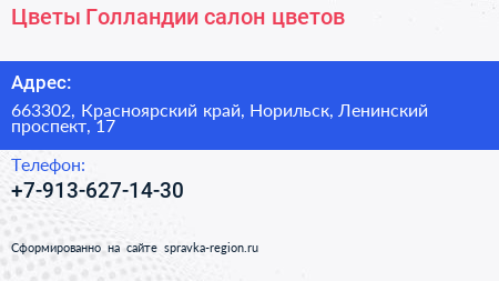 Цветы Голландии, салон цветов по адресу 663302, Красноярский край, Норильск, Ленинский проспект, 17 в дальнейшем Организация, размещена в следующих категориях: