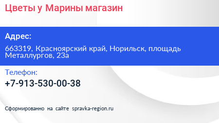 Цветы у Марины, магазин по адресу 663319, Красноярский край, Норильск, площадь Металлургов, 23а в дальнейшем Организация, размещена в следующих категориях: