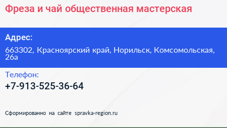 Фреза и чай, общественная мастерская по адресу 663302, Красноярский край, Норильск, Комсомольская, 26а в дальнейшем Организация, размещена в следующих категориях: