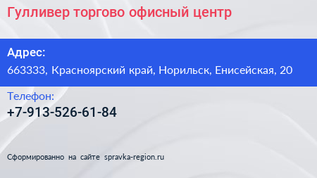 Гулливер, торгово-офисный центр по адресу 663333, Красноярский край, Норильск, Енисейская, 20 в дальнейшем Организация, размещена в следующих категориях: