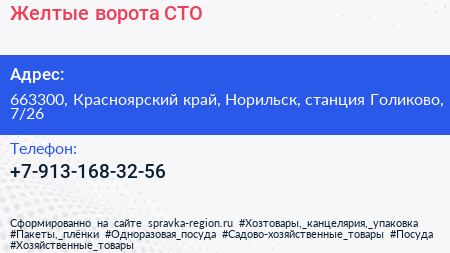 Желтые ворота, СТО по адресу 663300, Красноярский край, Норильск, станция Голиково, 7/26 в дальнейшем Организация, размещена в следующих категориях:
