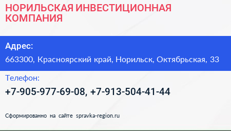 НОРИЛЬСКАЯ ИНВЕСТИЦИОННАЯ КОМПАНИЯ по адресу 663300, Красноярский край, Норильск, Октябрьская, 33 в дальнейшем Организация, размещена в следующих категориях: