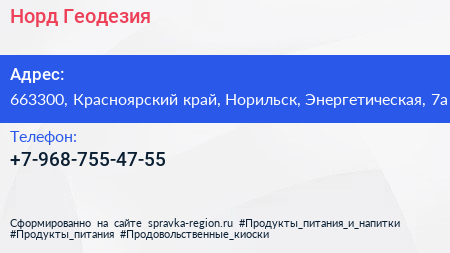 Норд-Геодезия по адресу 663300, Красноярский край, Норильск, Энергетическая, 7а в дальнейшем Организация, размещена в следующих категориях: