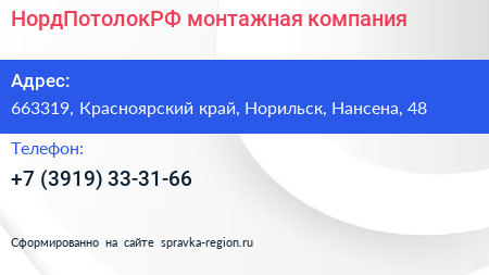 НордПотолокРФ, монтажная компания по адресу 663319, Красноярский край, Норильск, Нансена, 48 в дальнейшем Организация, размещена в следующих категориях:
