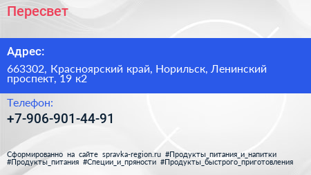 Пересвет по адресу 663302, Красноярский край, Норильск, Ленинский проспект, 19 к2 в дальнейшем Организация, размещена в следующих категориях: