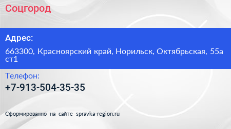 Соцгород по адресу 663300, Красноярский край, Норильск, Октябрьская, 55а ст1 в дальнейшем Организация, размещена в следующих категориях: