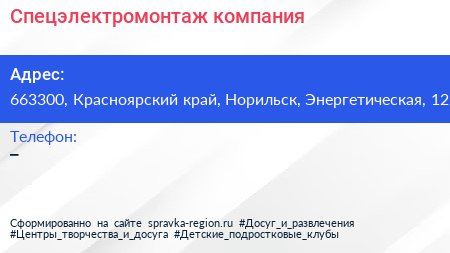 Спецэлектромонтаж, компания по адресу 663300, Красноярский край, Норильск, Энергетическая, 12 в дальнейшем Организация, размещена в следующих категориях: