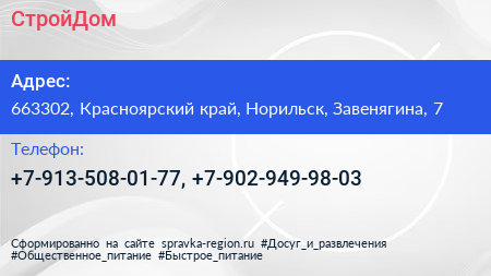 СтройДом по адресу 663302, Красноярский край, Норильск, Завенягина, 7 в дальнейшем Организация, размещена в следующих категориях: