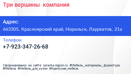 Три вершины+, компания по адресу 663305, Красноярский край, Норильск, Лауреатов, 21а в дальнейшем Организация, размещена в следующих категориях: