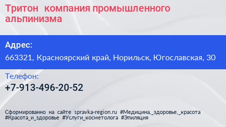 Тритон+, компания промышленного альпинизма по адресу 663321, Красноярский край, Норильск, Югославская, 30 в дальнейшем Организация, размещена в следующих категориях: